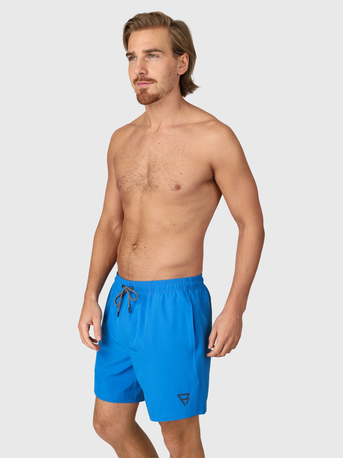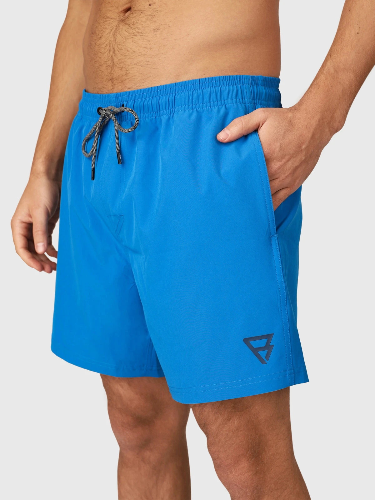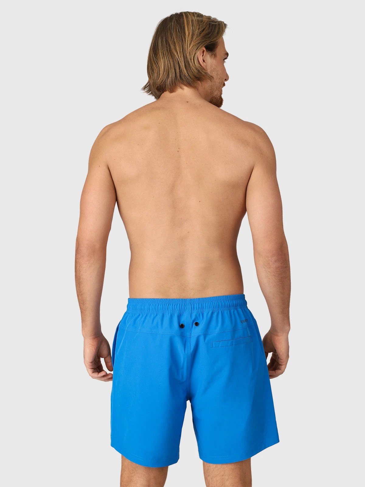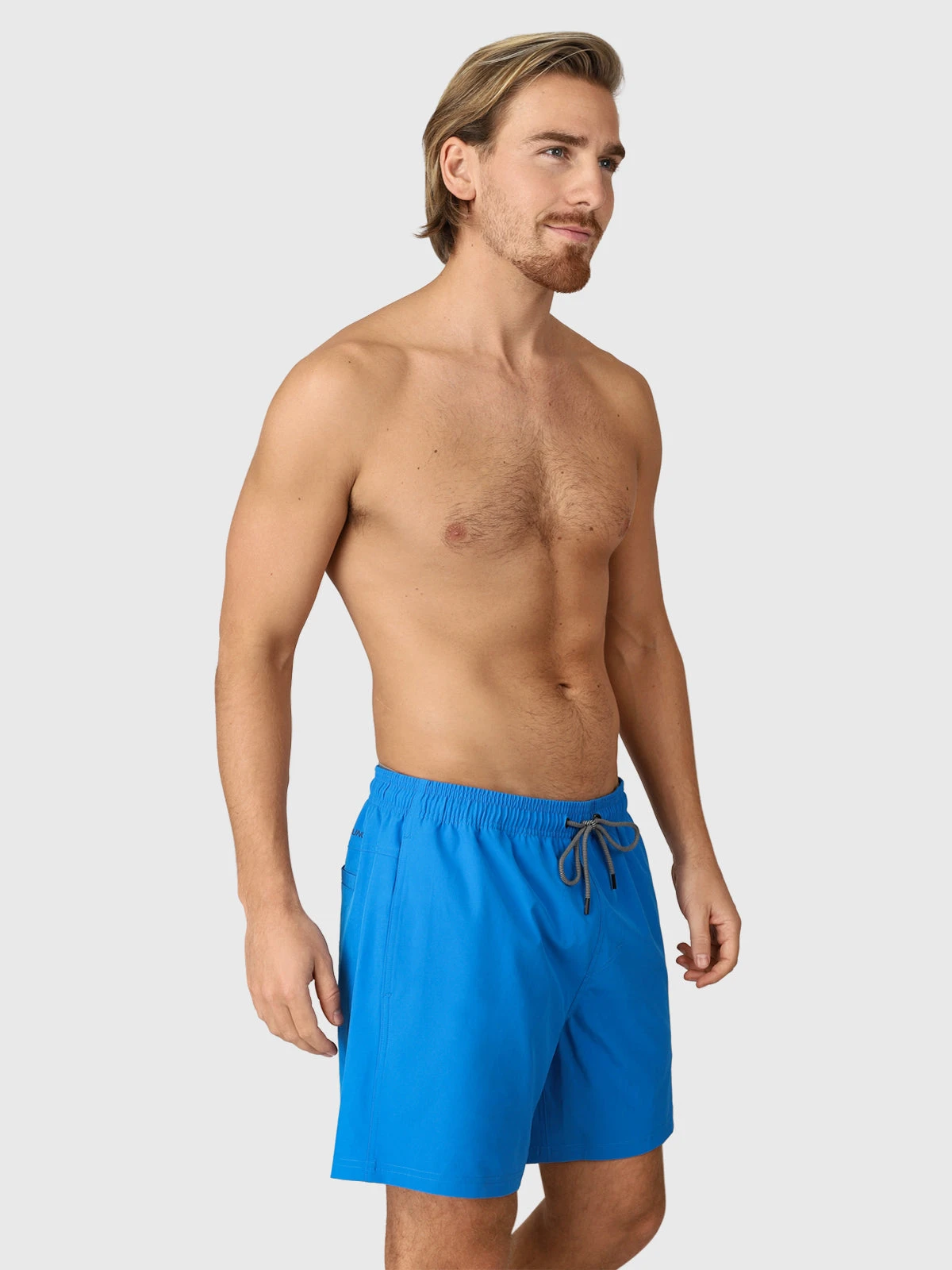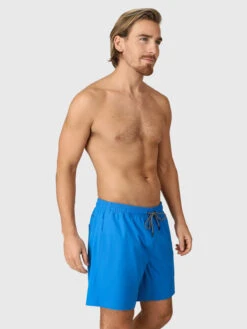 Sporty men’s swimming shorts Calaro-R. These quick-drying swim shorts with stretch have an elasticated waistband that you can tighten with a nice drawstring. They have mesh inner shorts and two side pockets. They are made of recycled material.