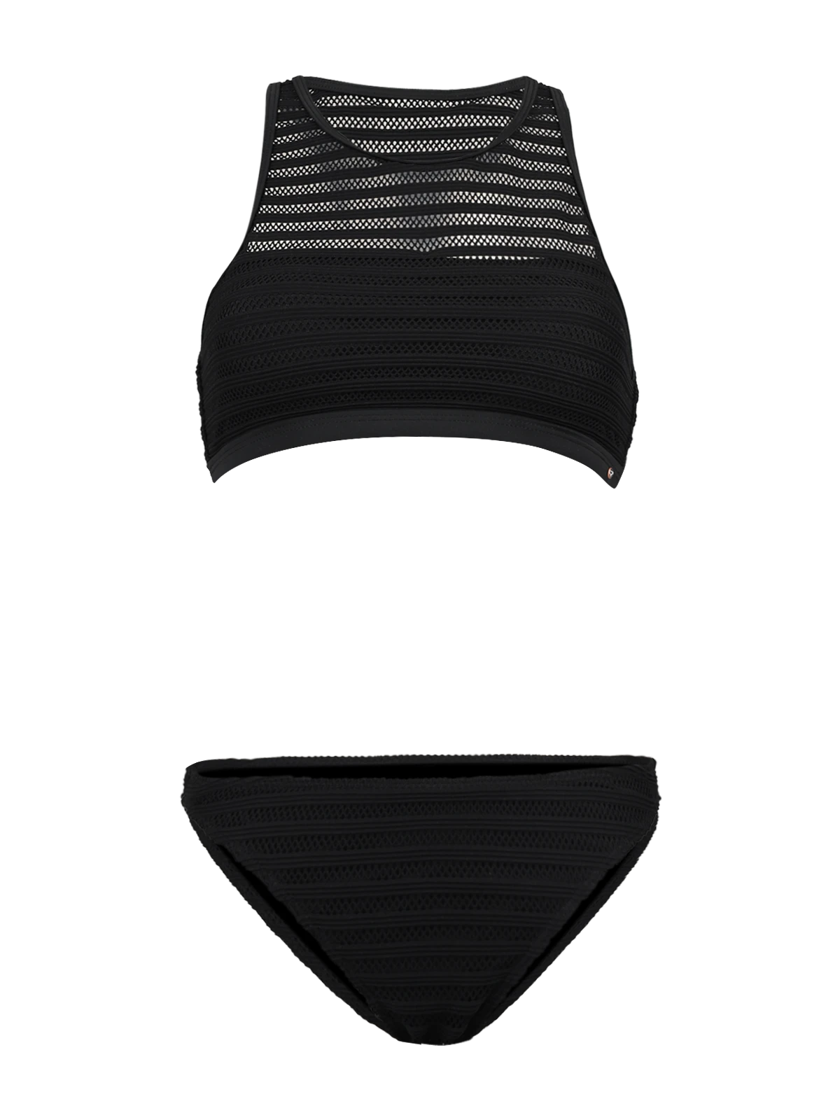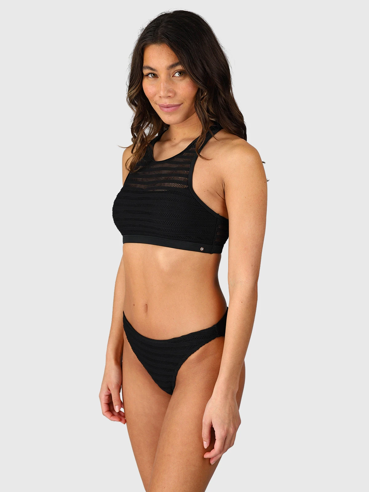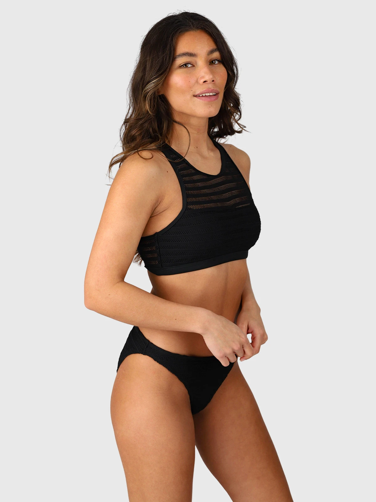 The Elena Bikini Set offers a modern and sporty look with its racerback design and mesh layered style. The mesh detailing adds texture and a sleek, sophisticated touch, while the racerback ensures a flattering and comfortable fit. The adjustable straps provide a customizable fit for support, and the bikini bottoms complete the look with a secure and flattering silhouette. A perfect choice for those seeking a blend of style and performance on your next sunny getaway.