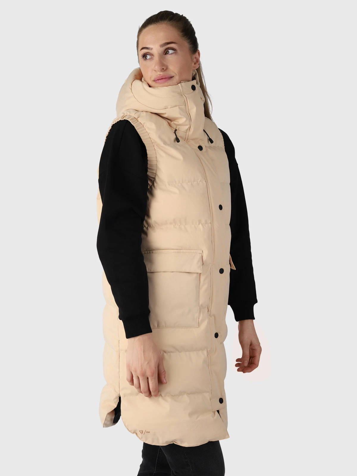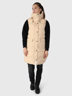 This women’s long body warmer is made of recycled material. The padding looks like down but is made of ultra-light fake down, which provides a perfect balance between warmth and ventilation. The supple material is wind and water resistant. The Brunotti Kalani is nice and long, has a two-way zipper and combines well with a fleece or sweatshirt.